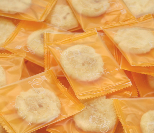 ご進物 枝豆風せんべい 畑でふっくらと実った枝豆。夏の空に美しい緑色が映えます。そんな枝豆をイメージして、草加せんべいに取り込みました。 枝豆はおよそ一か月のちに収穫する時には大豆になります。『枝豆せんべい』は、粗挽き大豆を生地に練りこみ、青大豆粉をふんだんにまぶしておせんべいに枝豆の味を再現いたしました。隠し味にグリンピースの粉末を使用し、自然の彩が豊かです。ほんのり甘く、ほどよい塩加減がどこか懐かしい味わいです。大地の香りをお楽しみください。