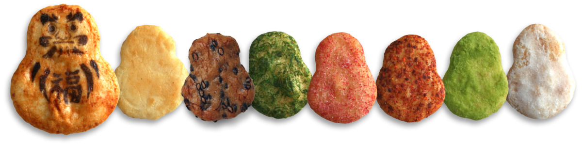 | 原材料 | うるち米(国産)、砂糖、醤油、ごま、植物油、梅肉粉、醗酵調味液、唐辛子、食塩、青のり粉、でん粉、抹茶、みりん、昆布エキス、乾燥卵白/糊料(加工デンプン)、調味料(アミノ酸等)、着色料(カラメル、タマリンド色素)、(一部に小麦・卵・ごま・大豆を含む) |
