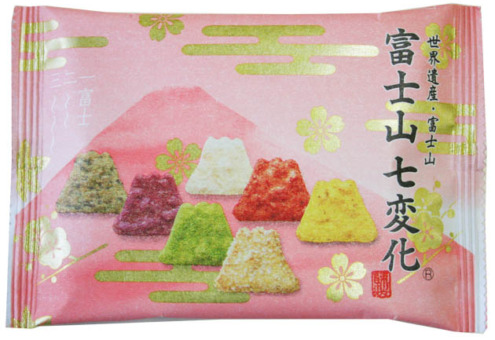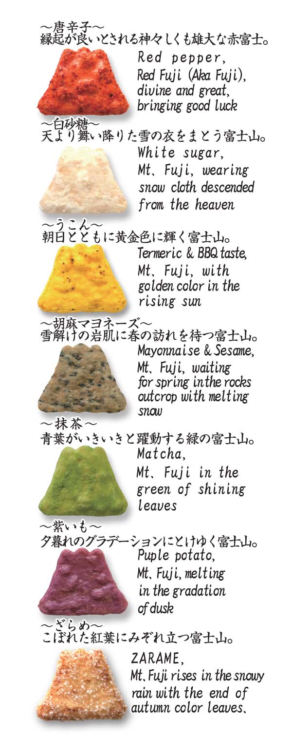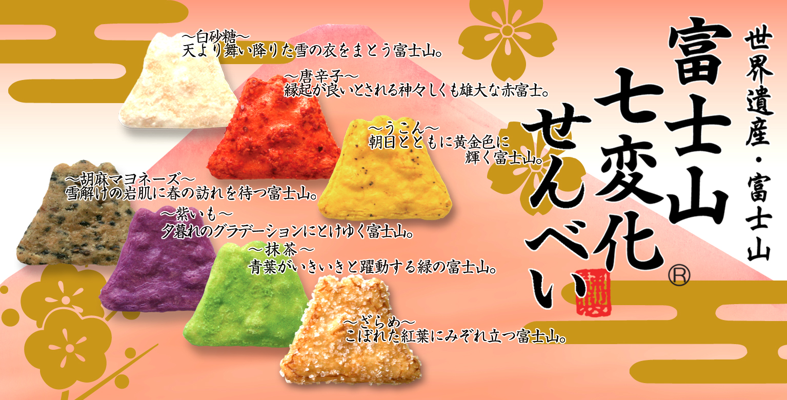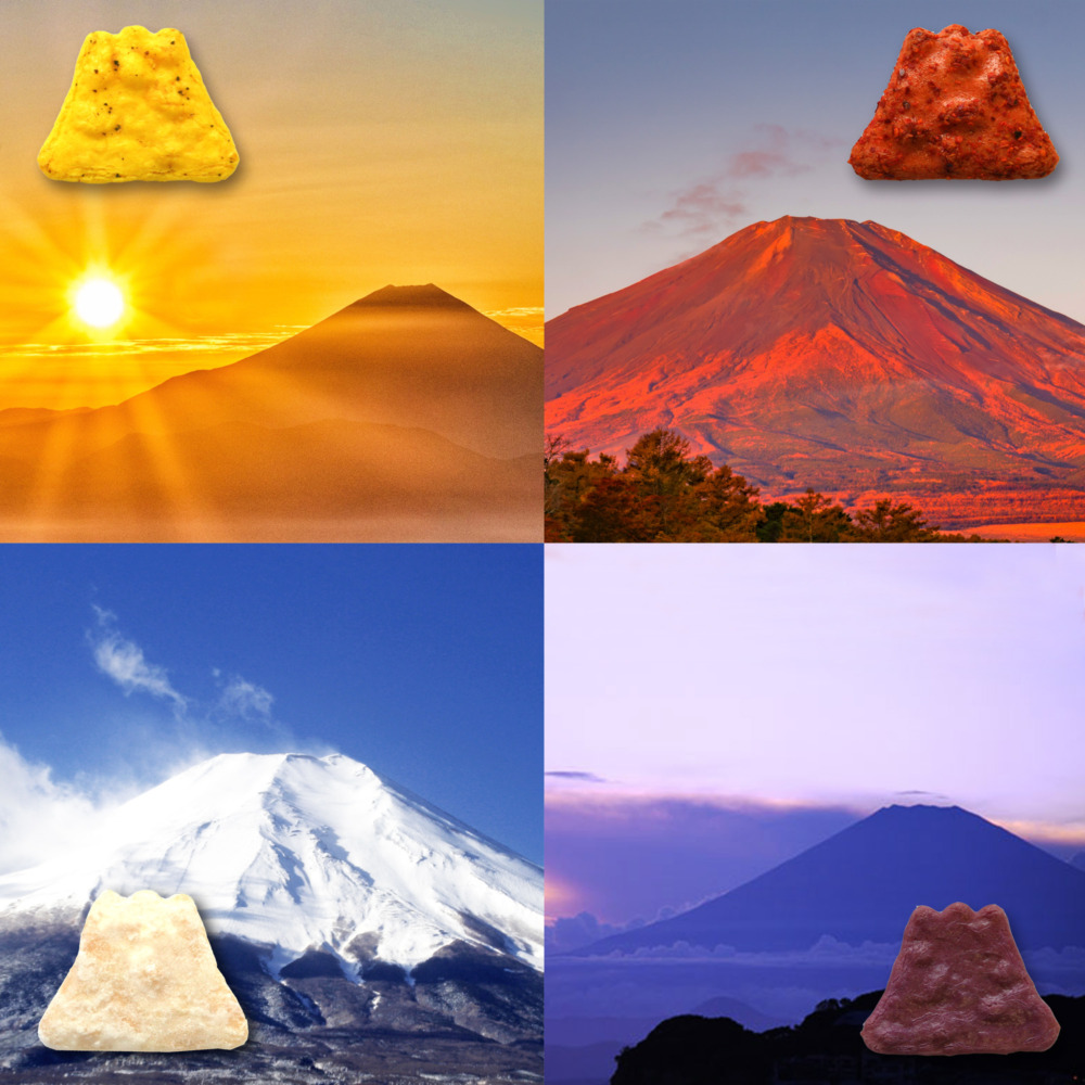 季節や時間の流れによって刻々と変化する富士山の表情を、7種類の味わいと彩りでおせんべいに創り上げました。