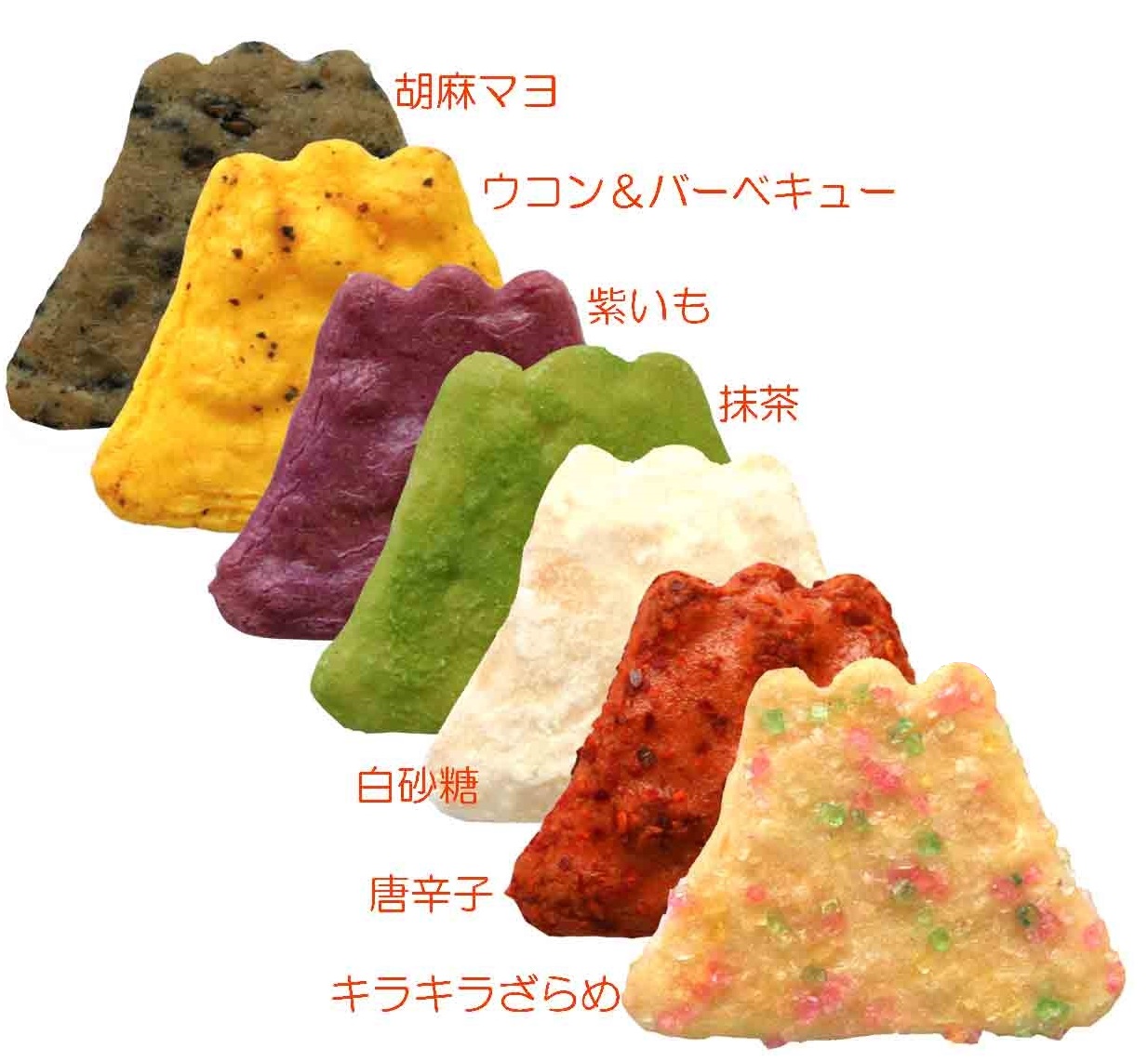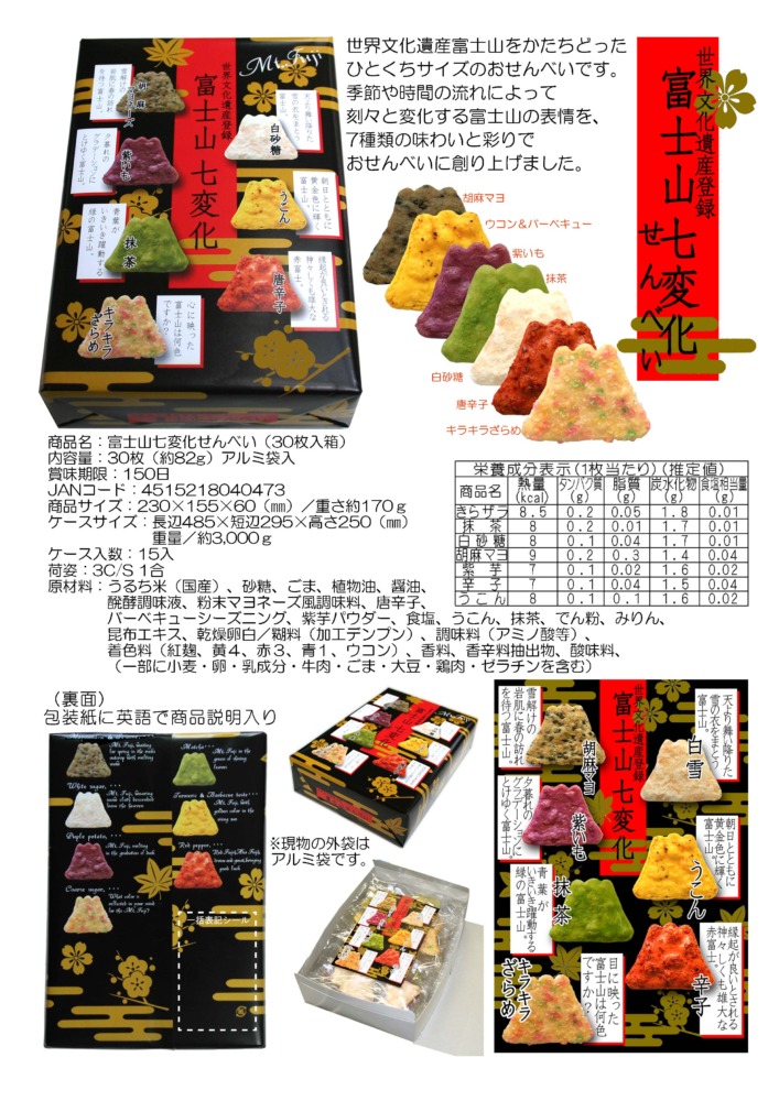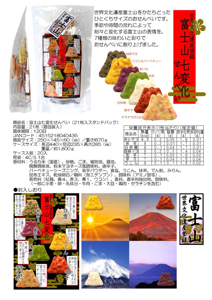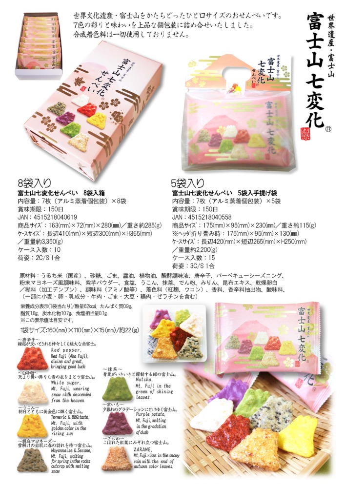 季節や時間の流れによって刻々と変化する富士山の表情を、7種類の味わいと彩りでおせんべいに創り上げました。