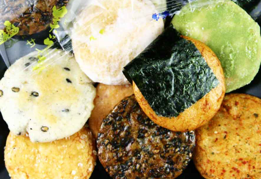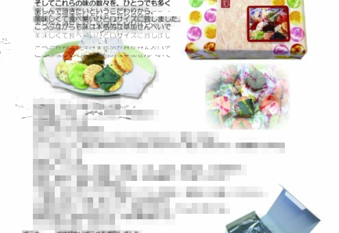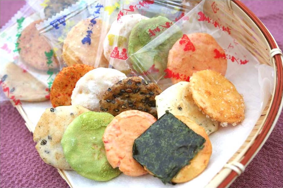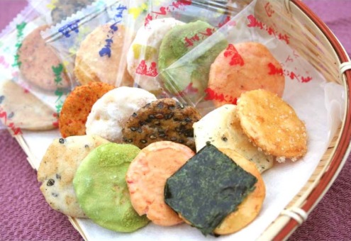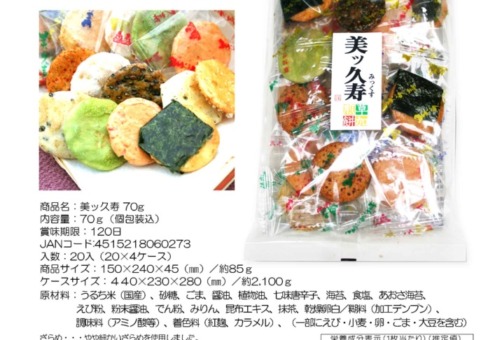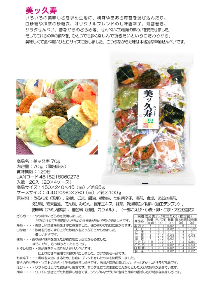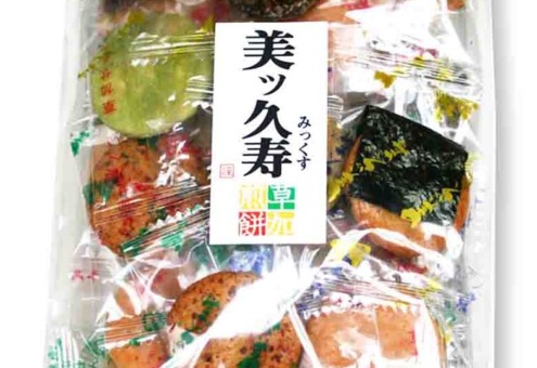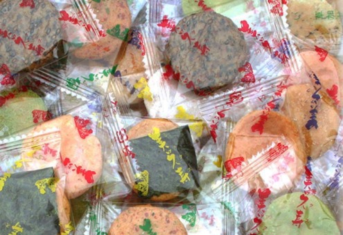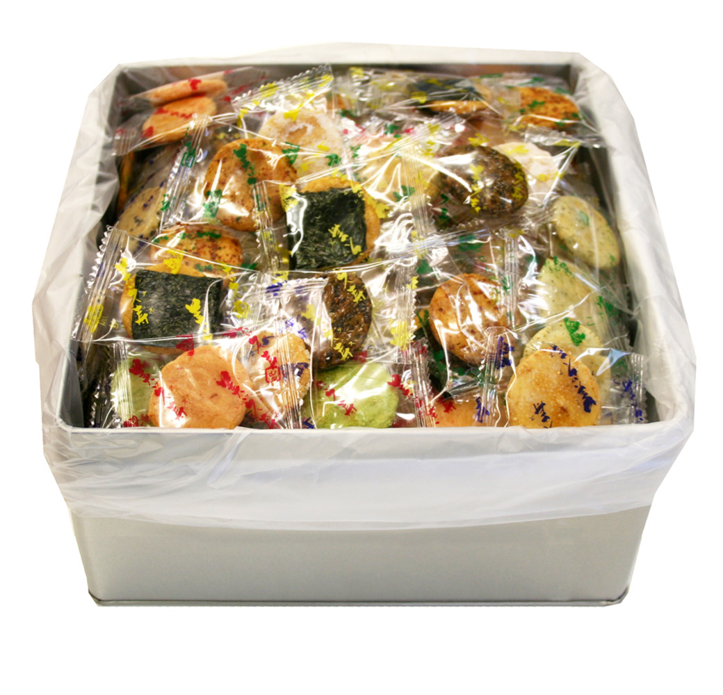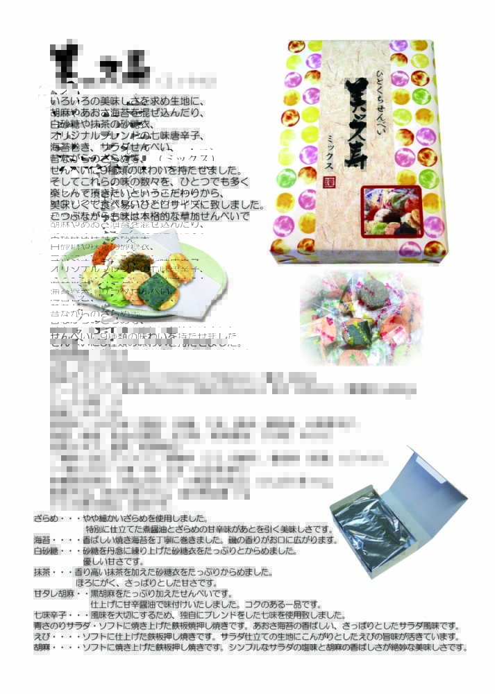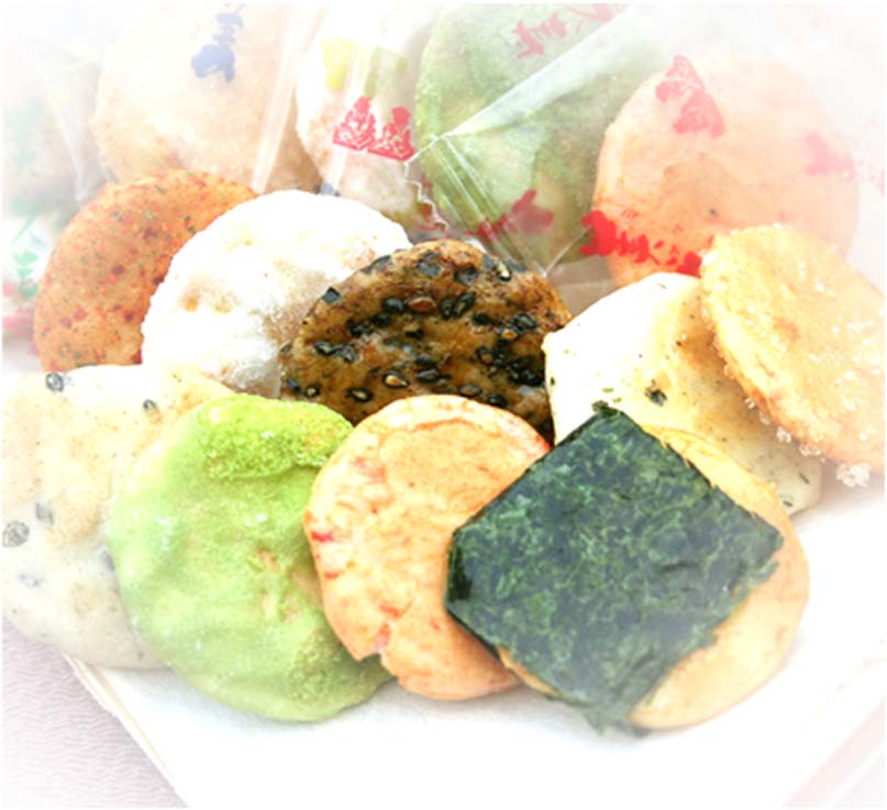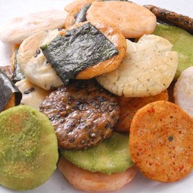 | 原材料 | うるち米(国産)、砂糖、ごま、醤油、植物油、七味唐辛子、海苔、食塩、あおさ海苔、えび粉、粉末醤油、でん粉、みりん、昆布エキス、抹茶、乾燥卵白/糊料(加工デンプン)、調味料(アミノ酸等)、着色料(紅麹、カラメル)、(一部にえび・小麦・卵・ごま・大豆を含む)うるち米(国産)、 |
